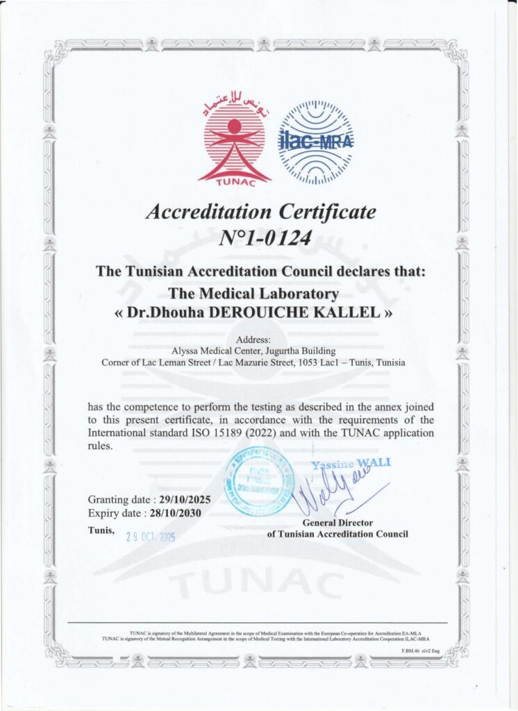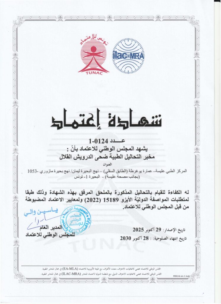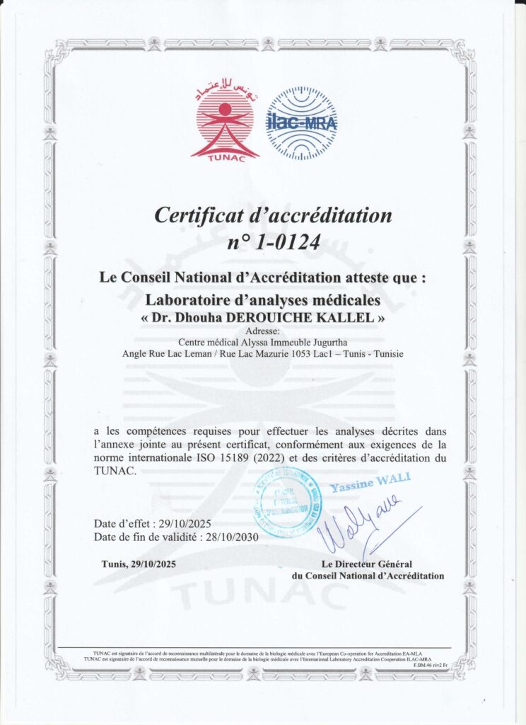 L ’accréditation de notre laboratoire iso15189 n’est pas une simple distinction, elle confirme notre engagement à offrir des résultats précis, un service performant et un accompagnement de qualité à nos patients, prescripteurs et partenaires L’obtention de cette accréditation vient couronner un travail rigoureux mené par l’ensemble de notre équipe, mobilisée autour de l’amélioration continue, de la sécurité du patient et du respect des bonnes pratiques professionnelles. Nous continuerons à renforcer nos processus et à développer nos compétences pour garantir un niveau de qualité constamment élevé, au service de votre santé et de votre confiance.